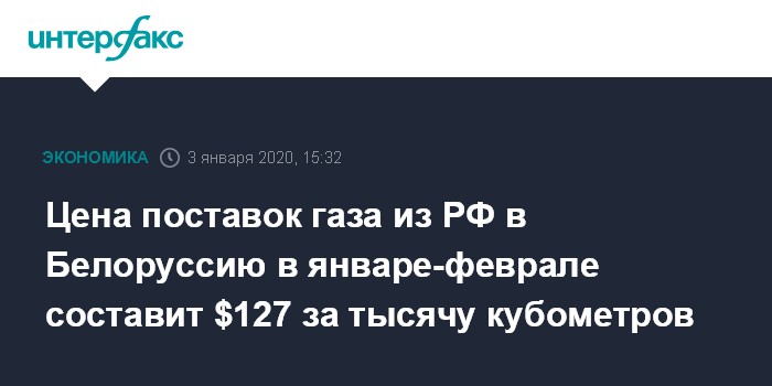 Москва. 3 января. INTERFAX.RU - Цена поставок российского газа в Белоруссию в первые два месяца наступившего года составит $127 за 1 тыс. кубометров, говорится в сообщении Минэнерго Белоруссии.