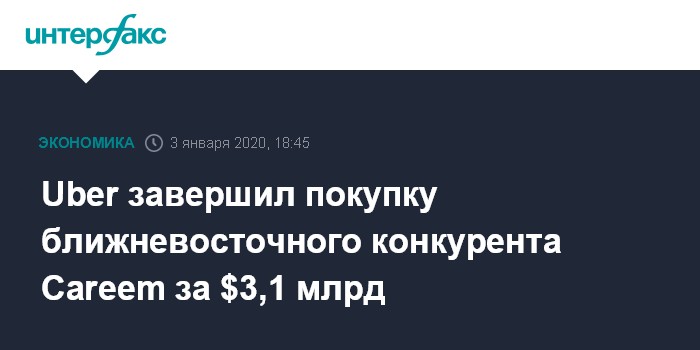 Москва. 3 января. INTERFAX.RU - Американская Uber Technologies Inc., предоставляющая услуги по заказу такси и доставке еды, закрыла сделку по покупке ближневосточного конкурента Careem Networks за $3,1 млрд.