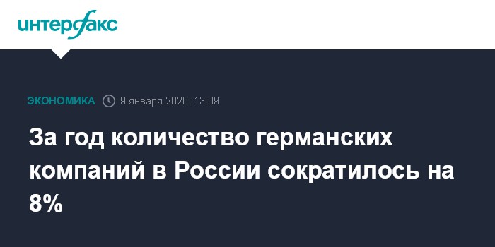 Москва. 9 января. INTERFAX.RU - В России работает 4274 немецких предприятия, это на 8% меньше, чем было в конце 2018 года, сообщила Российско-германская внешнеторговая палата (ВТП), ссылаясь на данные ФНС. До начала украинского кризиса в России было почти 6200 германских компаний, заявил через пресс-службу предправления ВТП Маттиас Шепп.