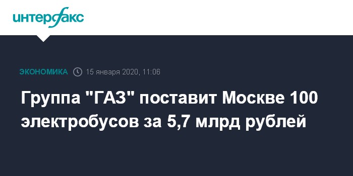Москва. 15 января. INTERFAX.RU - ООО "Русские автобусы - Группа ГАЗ" в 2020 году поставит Москве 100 электробусов за 5,692 млрд рублей и обеспечит их обслуживание до 31 мая 2035 года, следует из материалов госзакупок. Ранее стало известно, что еще 200 электробусов городу поставит "КАМАЗ" - за 11,384 млрд рублей.