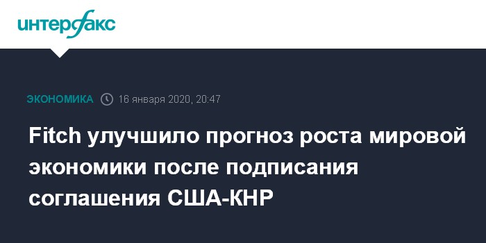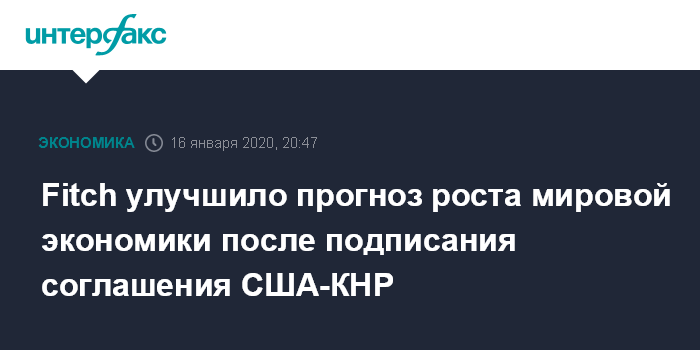 Москва. 16 января. INTERFAX.RU - Международное рейтинговое агентство Fitch улучшило прогноз роста мировой экономики на 2020 год вслед за подписанием США и Китаем соглашения о первой фазе урегулирования торгового спора.