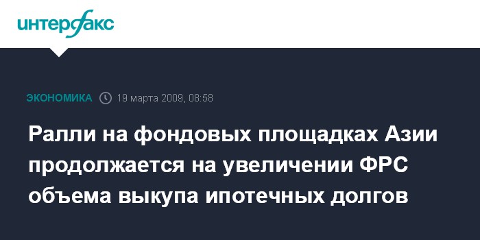 Москва. 19 марта. INTERFAX.RU - Фондовые площадки АТР сохраняют в четверг повышательные тенденции уже пятую сессию подряд после того, как Федеральная резервная система (ФРС) США объявила об увеличении объемов выкупа ипотечных ценных бумаг и гособлигаций, сообщило агентство Bloomberg.