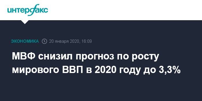 Москва. 20 января. INTERFAX.RU - Международный валютный фонд (МВФ) ухудшил собственный прогноз по росту мировой экономики в 2020 году на 0,1 процентного пункта (п.п.), до 3,3%. Оценку изменения ВВП России фонд оставил прежней - рост на 1,9%. Это говорится в январском обзоре мировой экономики (World Economic Outlook. Update).