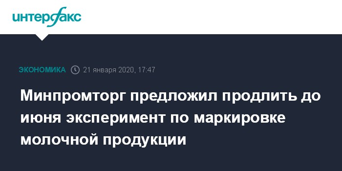 Москва. 21 января. INTERFAX.RU - Минпромторг предложил продлить эксперимент по маркировке молочной продукции на три месяца - по 31 мая 2020 года, говорится в проекте постановления правительства на сайте regulation.gov.ru.