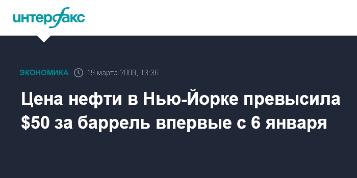 Москва. 19 марта. INTERFAX.RU - Цена нефти в ходе торгов в Нью-Йорке в четверг превысила отметку в $50 за баррель впервые с 6 января, сообщило агентство Bloomberg.