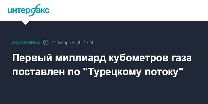 Москва. 27 января. INTERFAX.RU - "Газпром" поставил по газопроводу "Турецкий поток" первый миллиард кубометров газа, сообщила российская компания.