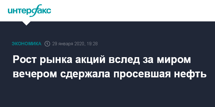 Москва. 29 января. INTERFAX.RU - Рынок акций РФ в среду подрос вслед за мировыми фондовыми площадками благодаря некоторому ослаблению опасений, связанных с распространением нового коронавируса в Китае и за его пределами, однако "бычий" настрой в конце торгов был омрачен просевшей нефтью на статистике Минэнерго США.