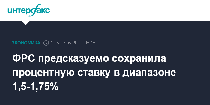 Москва. 30 января. INTERFAX.RU - Федеральная резервная система (ФРС) сохранила процентную ставку по федеральным кредитным средствам (federal funds rate) в диапазоне от 1,5% до 1,75% годовых, говорится в коммюнике Федерального комитета по открытым рынкам (FOMC) по итогам заседания, прошедшего 28-29 января.