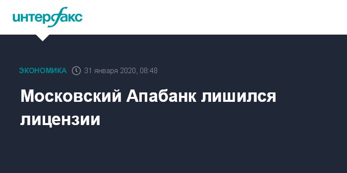 Москва. 31 января. INTERFAX.RU - Банк России с 31 января отозвал лицензию у московского АО "Апабанк", сообщила пресс-служба регулятора. По данным ЦБ, по величине активов кредитная организация занимала 369-е место в банковской системы страны. Банк не был участником системы страхования вкладов.