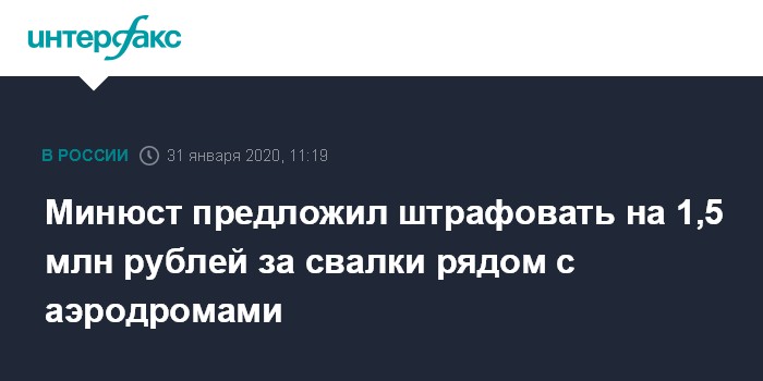Москва. 31 января. INTERFAX.RU - В проекте нового Кодекса об административных правонарушениях (КоАП), предусмотрены штрафы до 1,5 млн рублей за организацию свалок на приаэродромных территориях. Документ, подготовленный Минюстом, опубликован на на портале общественной экспертизы нормативных актов. Свалки привлекают птиц, которые угрожают безопасности полетов.