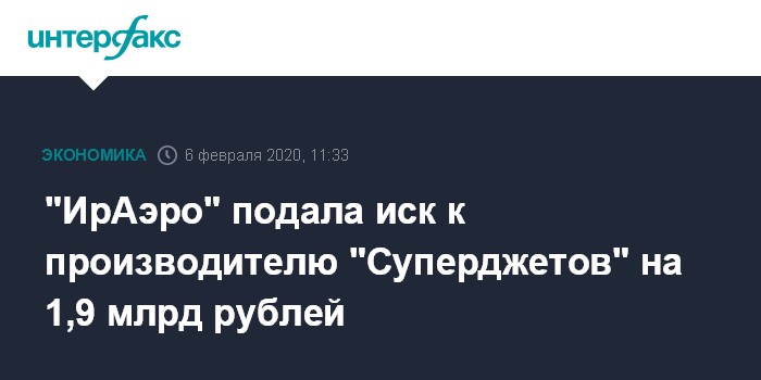 Москва. 6 февраля. INTERFAX.RU - Иркутская авиакомпания "ИрАэро" подала в Арбитражный суд Москвы иск к АО "Гражданские самолеты Сухого" (ГСС) на 1,854 млрд рублей. Как следует из материалов суда, он был зарегистрирован 4 февраля, но еще не принят к производству.