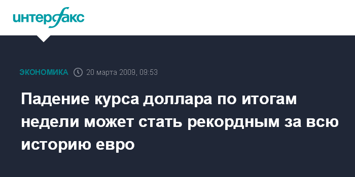 Москва. 20 марта. INTERFAX.RU - Падение курса доллара к единой европейской валюте за неделю может стать рекордным за всю историю евро после того, как Федеральная резервная система (ФРС) увеличила объем валюты в экономике, неожиданно заявив о покупке гособлигаций США, сообщило агентство Bloomberg.