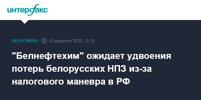 Москва. 10 февраля. INTERFAX.RU - Концерн "Белнефтехим" прогнозирует двукратное увеличение финансовых потерь белорусских НПЗ в 2020 году по сравнению с 2019 годом из-за реализации в РФ налогового маневра в нефтяной сфере.