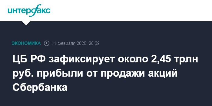 ЦБ РФ зафиксирует около 2,45 трлн руб. прибыли от продажи акций Сбербанка