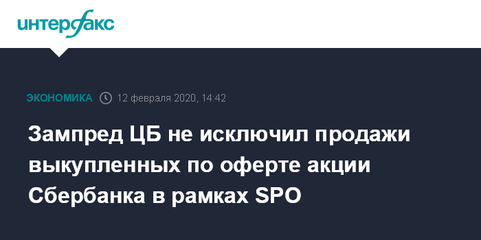 Москва. 12 февраля. INTERFAX.RU - ЦБ РФ может продать выкупленные по оферте акции Сбербанка России в рамках SPO, но не ждет большого объема выкупа, сообщил журналистам первый зампред Банка России Сергей Швецов.