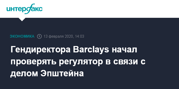 Москва. 13 февраля. INTERFAX.RU - Британское управление по контролю за соблюдением норм поведения на финансовых рынках (Financial Conduct Authority, FCA) начало проверку в отношении гендиректора банка Barclays Джеса Стейли в связи с характером его взаимотношений с финансистом Джеффри Эпштейном, который в августе 2019 года покончил с собой в в тюрьме Манхэттена.