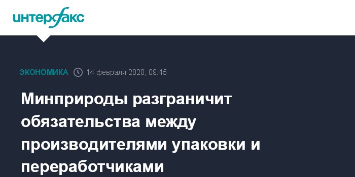 Москва. 14 февраля. INTERFAX.RU - Минприроды к марту представит вице-премьеру Виктории Абрамченко проект мер по разграничению экологических обязательств между производителями упаковки и предприятиями-переработчиками, сообщили в пресс-службе Абрамченко.