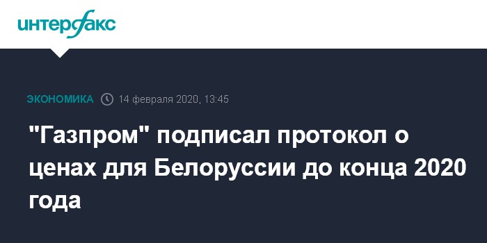 Москва. 14 февраля. INTERFAX.RU - Председатель правления "Газпрома" Алексей Миллер и посол Белоруссии Владимир Семашко подписали протокол между "Газпромом" и правительством республики, в соответствии с которым определен порядок формирования цен при поставке газа в Белоруссию в 2020 году.