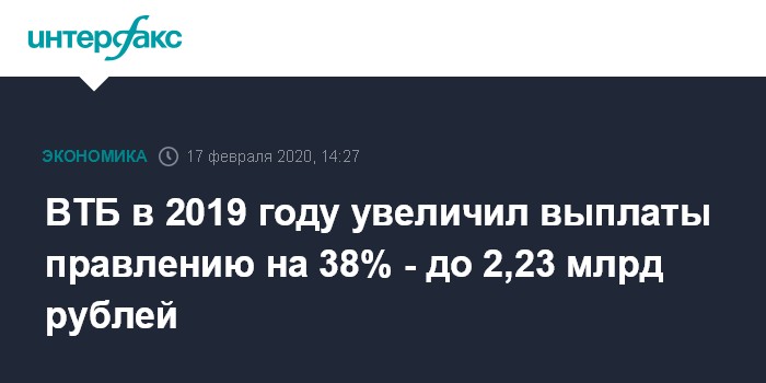 Москва. 17 февраля. INTERFAX.RU - Выплаты членам правления ВТБ в 2019 году были увеличены на 38% по сравнению с предыдущим годом и выросли с 1,62 млрд рублей до 2,23 млрд рублей, следует из квартального отчета банка по ценным бумагам.