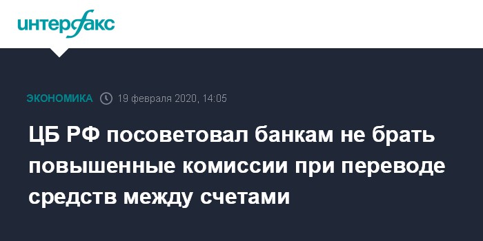 Москва. 19 февраля. INTERFAX.RU - ЦБ РФ рекомендовал банкам не взимать повышенные комиссии при проведении ряда операций, в том числе, при переводе средств с одного счета клиента на другой его счет, в том числе в другой кредитной организации.