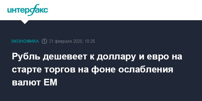 Москва. 21 февраля. INTERFAX.RU - Доллар и евро укрепляются на Московской бирже в пятницу утром; рубль дешевеет к бивалютной корзине на фоне снижения валют emerging markets (EM) из-за опасений ускорения распространения коронавируса за пределы Китая.