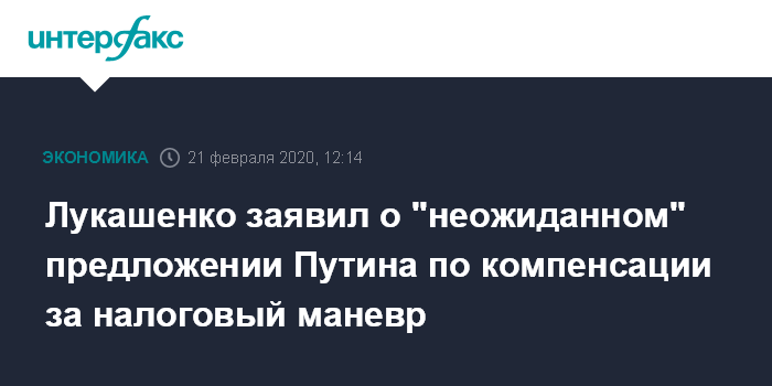 Москва. 21 февраля. INTERFAX.RU - Президент РФ Владимир Путин предложил Белоруссии компенсировать выпадающие от налогового маневра доходы бюджета за счет сохранения премии российским НК в цене поставок, сообщил белорусский лидер Александр Лукашенко; он также назвал поступившее предложение неожиданным.