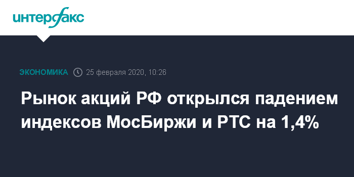 Москва. 25 февраля. INTERFAX.RU - Рынок акций РФ открылся во вторник падением цен большинства blue chips на фоне обвалившихся мировых площадок и нефти в начале недели из-за усиления опасений негативного влияния коронавируса из Китая на мировую экономику; индексы РТС и МосБиржи за минуту торгов потеряли по 1,4%, при этом растут бумаги золотодобывающих компаний во главе с акциями ПАО "Полюс".