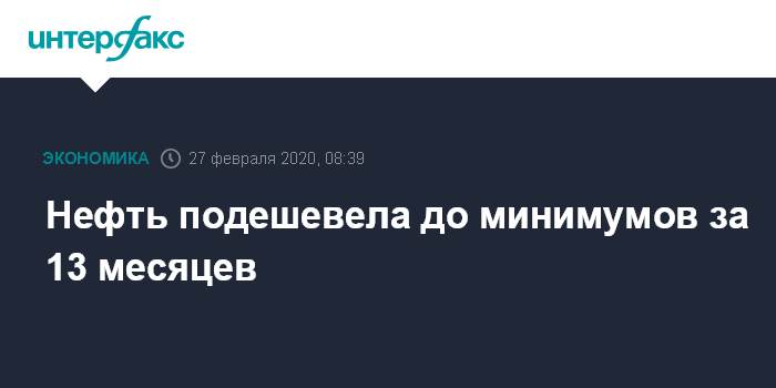 Москва. 27 февраля. INTERFAX.RU - Котировки нефти продолжают снижаться в четверг утром после того, как в среду они достигли минимумов за последние 13 месяцев. На них продолжают давить опасения о том, что эпидемия нового коронавируса негативно повлияет на глобальную экономику, а значит и на спрос на нефть, объясняет Dow Jones.