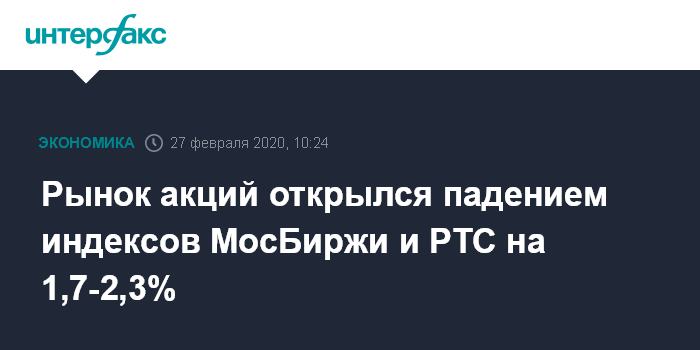 Москва. 27 февраля. INTERFAX.RU - Рынок акций РФ на старте торгов в четверг возобновил падение цен blue chips на фоне очередной волны отката мировых фондовых площадок и нефти из-за опасений относительно последствий коронавируса для мировой экономики; индексы МосБиржи и РТС за минуту торгов упали на 1,7-2,3%, при этом вновь растут защитные бумаги золотодобытчиков во главе с ПАО "Полюс".