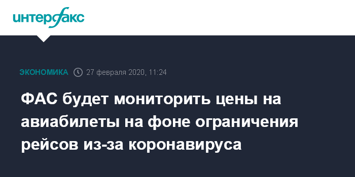 Москва. 27 февраля. INTERFAX.RU - Федеральная антимонопольная служба России обещает вести мониторинг цен на авиабилеты на фоне ограничений рейсов из-за эпидемии коронавируса.