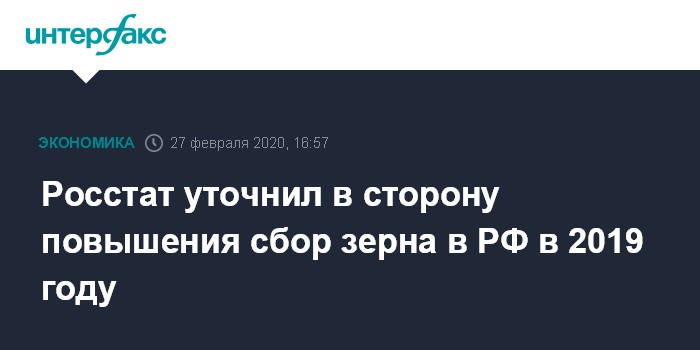 Москва. 27 февраля. INTERFAX.RU - Росстат уточнил валовой сбор зерна в РФ в 2019 году, он составил 121,2 млн тонн, сообщается в материалах ведомства. Ранее ведомство сообщало о 120,7 млн тонн.