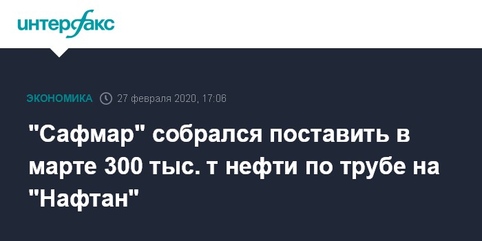 Москва. 27 февраля. INTERFAX.RU - Компании промышленно-финансовой группы "Сафмар" планируют поставить в марте 300 тысяч тонн нефти трубопроводным транспортом на белорусский НПЗ "Нафтан". Об этом сообщил "Интерфаксу" источник, знакомый с планами поставок на завод.