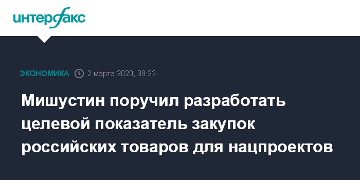 Москва. 2 марта. INTERFAX.RU - В России должна быть разработаны целевые показатели закупок российского оборудования для реализации нацпроектов, заявил премьер РФ Михаил Мишустин.