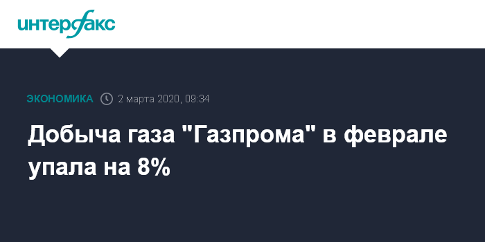 Москва. 2 марта. INTERFAX.RU - В теплом феврале 2020 года добыча газа "Газпромом" снизилась на 8% в годовом измерении после снижения в январе на 6,5% (показатели високосного февраля сравниваем с аналогичным периодом прошлого года по среднесуточным значениям). Таковы расчеты "Интерфакса" по оперативным данным ЦДК ТЭК.