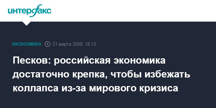 "Мы действительно столкнулись с проблемами, вызванными последствиями экономического кризиса - экономика России сильно зависит от экспорта природных ресурсов, неэнергетические сектора российской экономики работают несогласованно, банковско-финансовый сектор нашей страны развит недостаточно", - сказал Песков в интервью всемирной английской службе радио "Голос России".