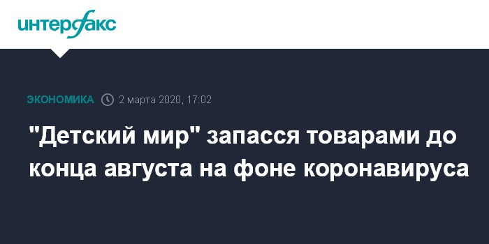 Москва. 2 марта. INTERFAX.RU - "Детский мир" сформировал дополнительные товарные запасы, которых хватит до конца августа, опасаясь перебоев с поставками из Китая из-за коронавируса.