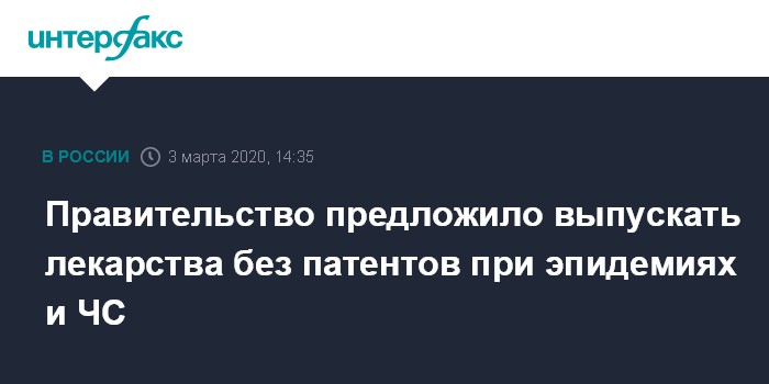 Москва. 3 марта. INTERFAX.RU - Правительство внесло в Госдуму законопроект о праве России в чрезвычайной ситуации и для борьбы с эпидемиями производить и экспортировать в страны - члены ВТО лекарства без согласия обладателей патентов. Поправки опубликованы в базе палаты.
