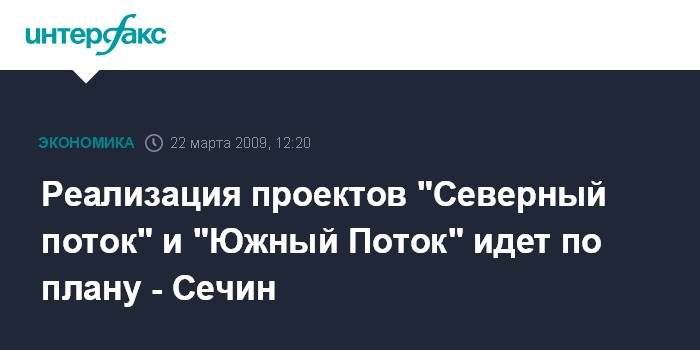 "Реализация всех крупных инфраструктурных проектов, в том числе "Северного потока" и "Южного потока", идет по плану", - сказал И.Сечин в воскресенье в интервью программе "Вести недели" телеканала "Россия".