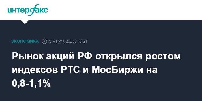 Москва. 5 марта. INTERFAX.RU - Рынок акций РФ открылся в четверг ростом цен blue chips вслед за подскочившей вверх накануне, 4 марта, фондовой Америкой на политических новостях и оптимизме по поводу мер, принятых властями и центробанками для борьбы с последствиями вспышки коронавируса для мировой экономики; индексы РТС и МосБиржи за минуту торгов прибавили 0,8-1,1%.