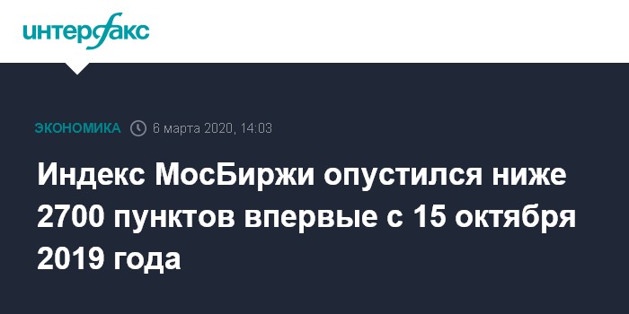 Москва. 6 марта. INTERFAX.RU - Индекс МосБиржи, один из основных российских фондовых индикаторов, днем в пятницу откатился ниже рубежа 2700 пунктов впервые с 15 октября прошлого года, индекс РТС обновил минимум с конца августа на фоне обвального падения нефти на опасениях замедления глобальной экономики из-за коронавируса COVID-19.