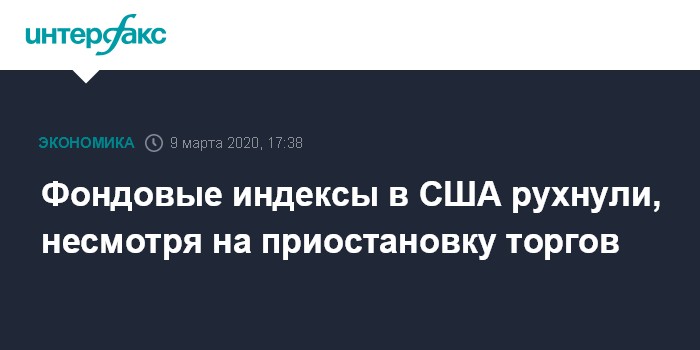 Москва. 9 марта. INTERFAX.RU - Фондовые индексы в США вслед за европейскими и азиатскими рынками рухнули в понедельник при открытии сессии на 7%, что привело к 15-минутной приостановке торгов.