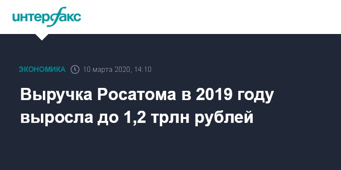 Москва. 10 марта. INTERFAX.RU - Выручка ГК "Росатом" (открытая часть) выросла в 2019 году на 12% и составила 1,2 трлн рублей, сообщается в корпоративной газете госкорпорации - "Страна Росатом".