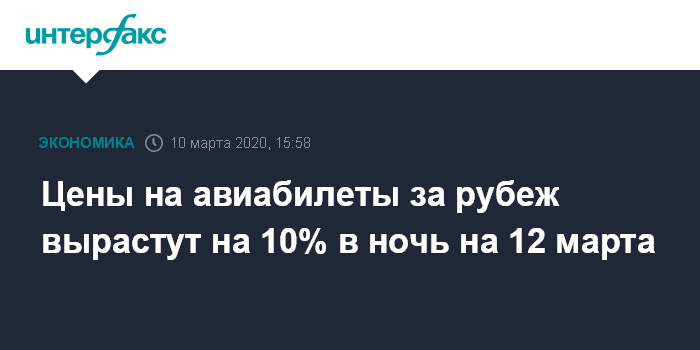 Москва. 10 марта. INTERFAX.RU - Цены на авиабилеты за рубеж вырастут на 10% в ночь на 12 марта из-за ослабления рубля к доллару и евро после падения цен на нефть, но на некоторых направлениях подорожание могут нивелировать акции и скидки авиакомпаний, связанные со снижением спроса из-за коронавируса, сообщили эксперты "Интерфаксу".