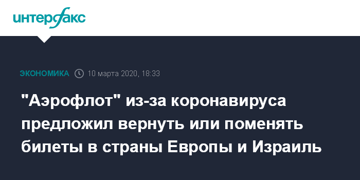 Москва. 10 марта. INTERFAX.RU - "Аэрофлот" на фоне распространения коронавируса в мире предлагает своим пассажирам вернуть или переоформить билеты на рейсы в ряд стран Европы и Израиль, говорится на сайте компании.