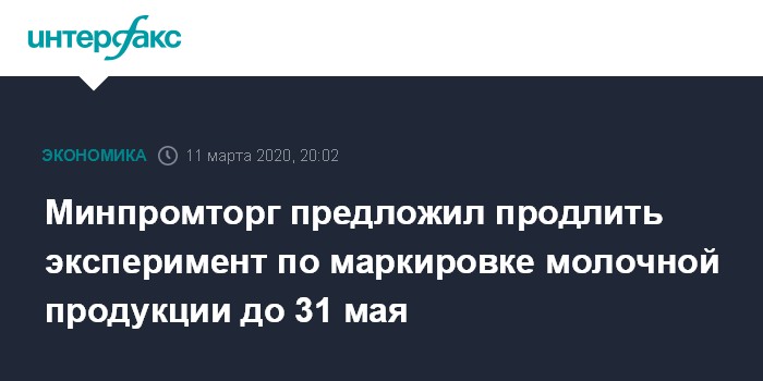 Москва. 11 марта. INTERFAX.RU - Минпромторг РФ предлагает продлить эксперимент по маркировке молочной продукции до 31 мая этого года. Ведомство подготовило соответствующий проект постановления правительства, который размещен на сайте regulation.gov.ru.