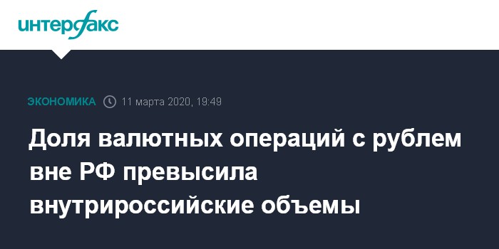 Москва. 11 марта. INTERFAX.RU - Объемы валютных операций с рублем по всем инструментам за пределами РФ в 2019 году превышали объемы на внутреннем российском рынке, говорится в обзоре ЦБ РФ.