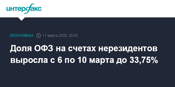 Москва. 11 марта. INTERFAX.RU - Доля ОФЗ на счетах иностранных кастодианов и нерезидентов в Национальном расчетном депозитарии (НРД) за период с 6 марта по 10 марта 2020 года выросла на 0,14 процентного пункта (п.п.), до 33,75%, говорится в сообщении НРД.