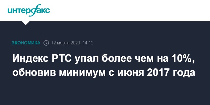 Москва. 12 марта. INTERFAX.RU - Падение индекса РТС, одного из основных российских фондовых индикаторов, в четверг превысило 10%, индикатор ушел ниже 1000 пунктов и обновил минимум с июня 2017 года на фоне панических общемировых распродаж из-за пандемии коронавируса и роста доллара к рублю.