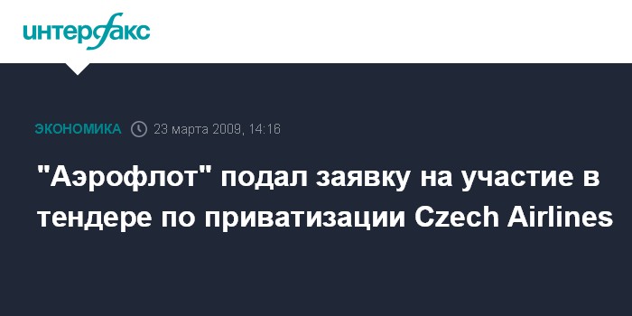 Москва. 23 марта. INTERFAX.RU - ОАО "Аэрофлот - российские авиалинии" подало в понедельник заявку на участие в тендере по приватизации чешского национального перевозчика Czech Airlines (CSA), сообщила российская компания. "Сегодня "Аэрофлот" передал в министерство финансов Чешской Республики документы, подтверждающие заинтересованность в участии в тендере на приватизацию 91,5% акций авиакомпании CSA", - отмечается в пресс-релизе.
