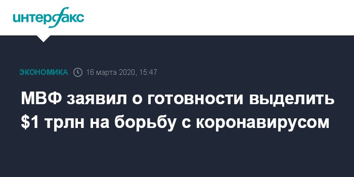 Москва. 16 марта. INTERFAX.RU - Международный валютный фонд готов мобилизовать $1 трлн на кредиты для оказания помощи странам в борьбе с коронавирусом, сообщила директор-распорядитель организации Кристалина Георгиева в блоге на сайте МВФ.